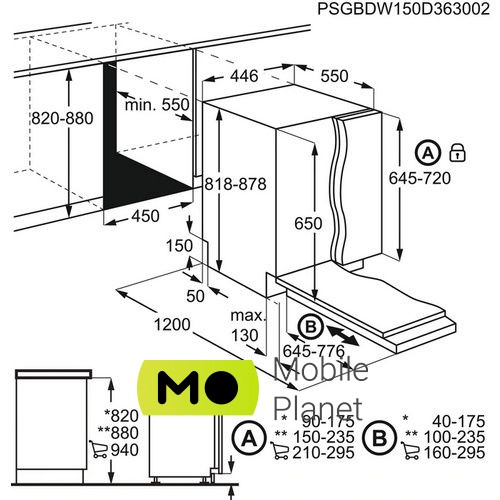 Установка: вбудовується; Реальний клас енергоспоживання: A +; Клас миття: A; Клас сушки: A; Завантаження, комплектів посуду: 9; Колір панелі управління: чорний; Розміри (ВхШхГ), мм: 818x446x550; Потужність підключення (Вт): 1950; Розміри для вбудовування (ВхШхГ), мм: 818x450x550; Номінальна напруга, В: 220-240