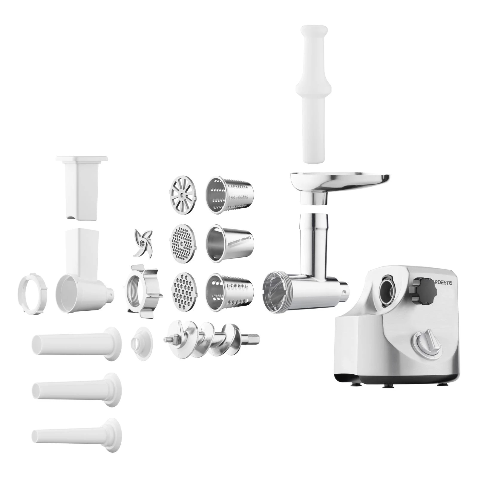 Максимальна потужність: 3000 Вт; Продуктивність: 2.6 кг/хв; Функція "Реверс": є; Диски для фаршу: 3 шт.; Насадки: насадка для ковбасок, шатківниця, тертка; Захист двигуна від перегріву: є; Матеріал корпусу: метал; Колір: сріблястий;
