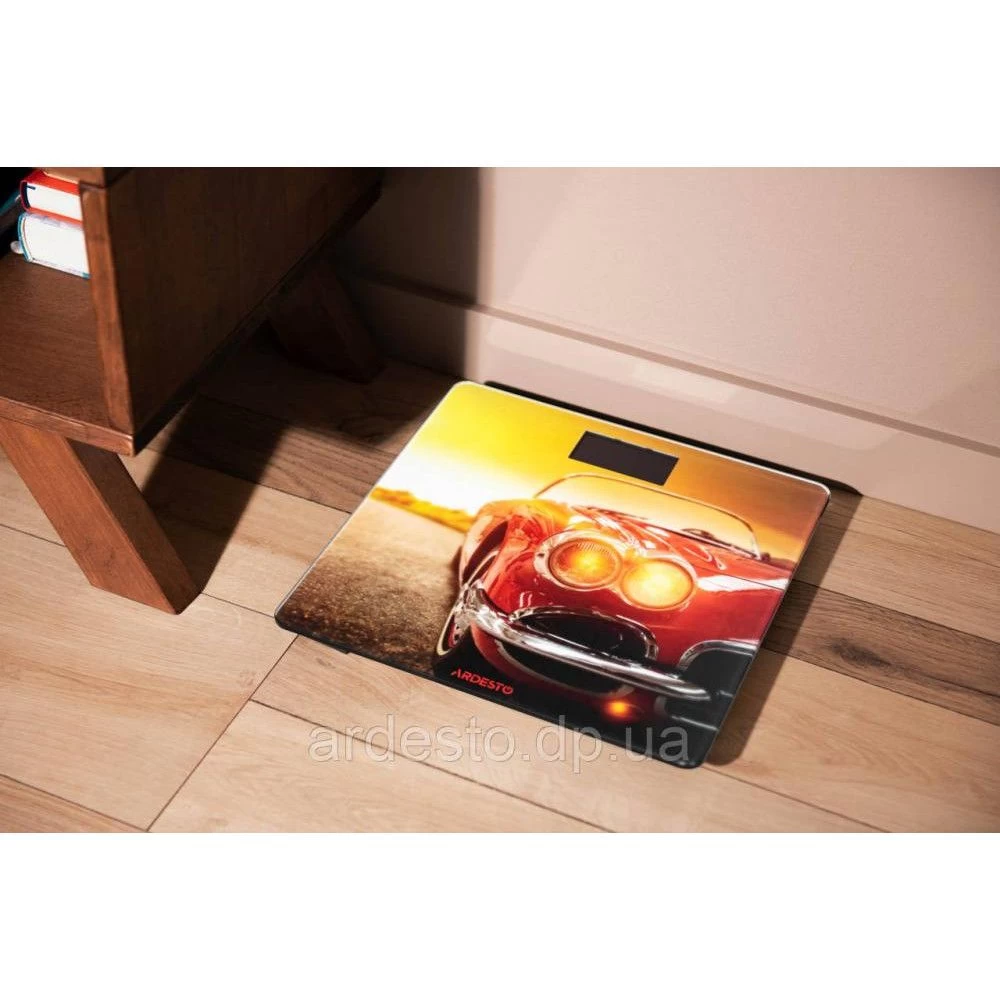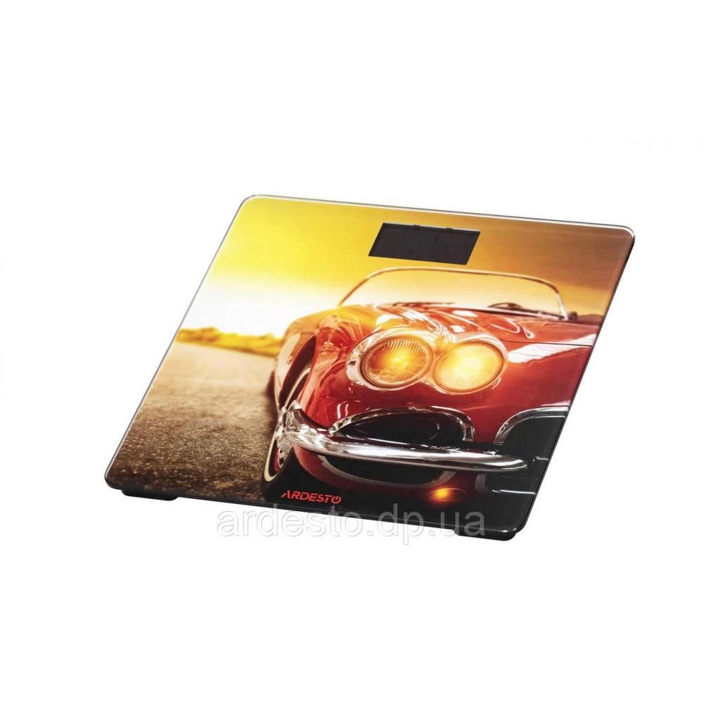 Бренд: Ardesto; Максимальна вимірювана вага, кг: 150; Мінімальний крок (ціна поділу), г: 50; Пам'ять (кількість користувачів): ні; Автоматичне вмикання/вимкнення: є; Матеріал корпусу: скло; Колір: жовто-коричневий рисунок авто; Живлення: 2 х ААА; Розрахунок індексу маси тіла (BMI): ні; Діагностичні функції: ні