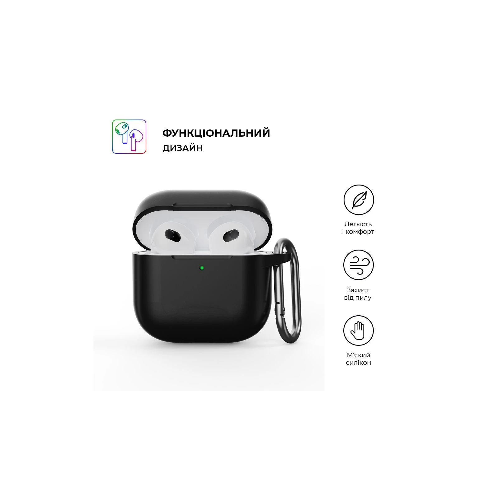 Основні характеристики; Сумісність: AirPods 4; Особливості: Карабін; Колір: чорний;