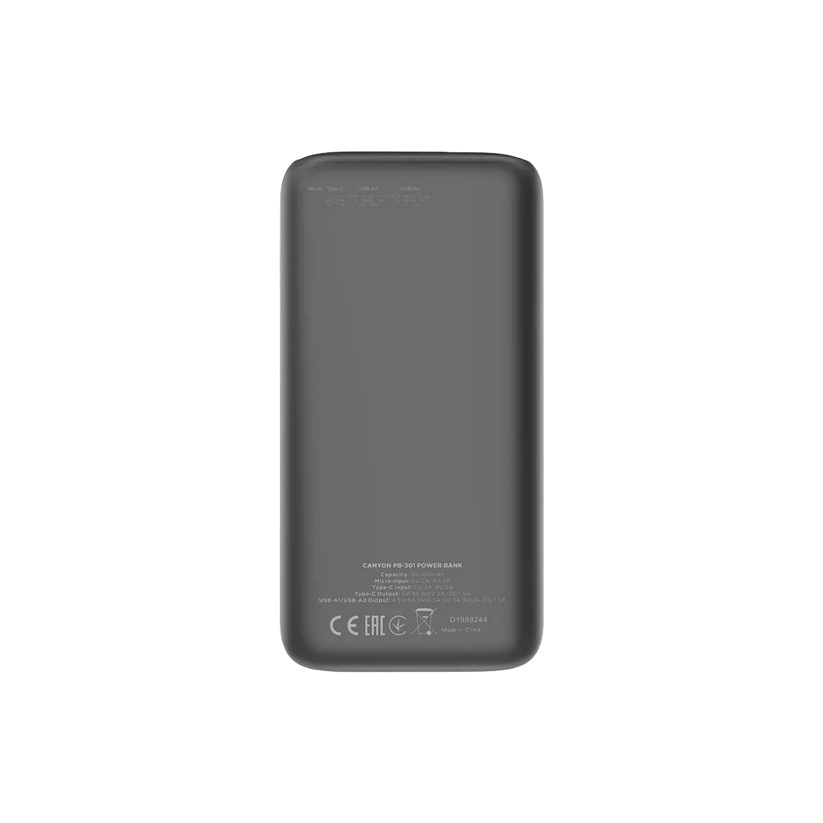 Мобільна батарея Canyon PB-301 30000mAh PD/20W, QC/3.0 (CNE-CPB301B) (UA)