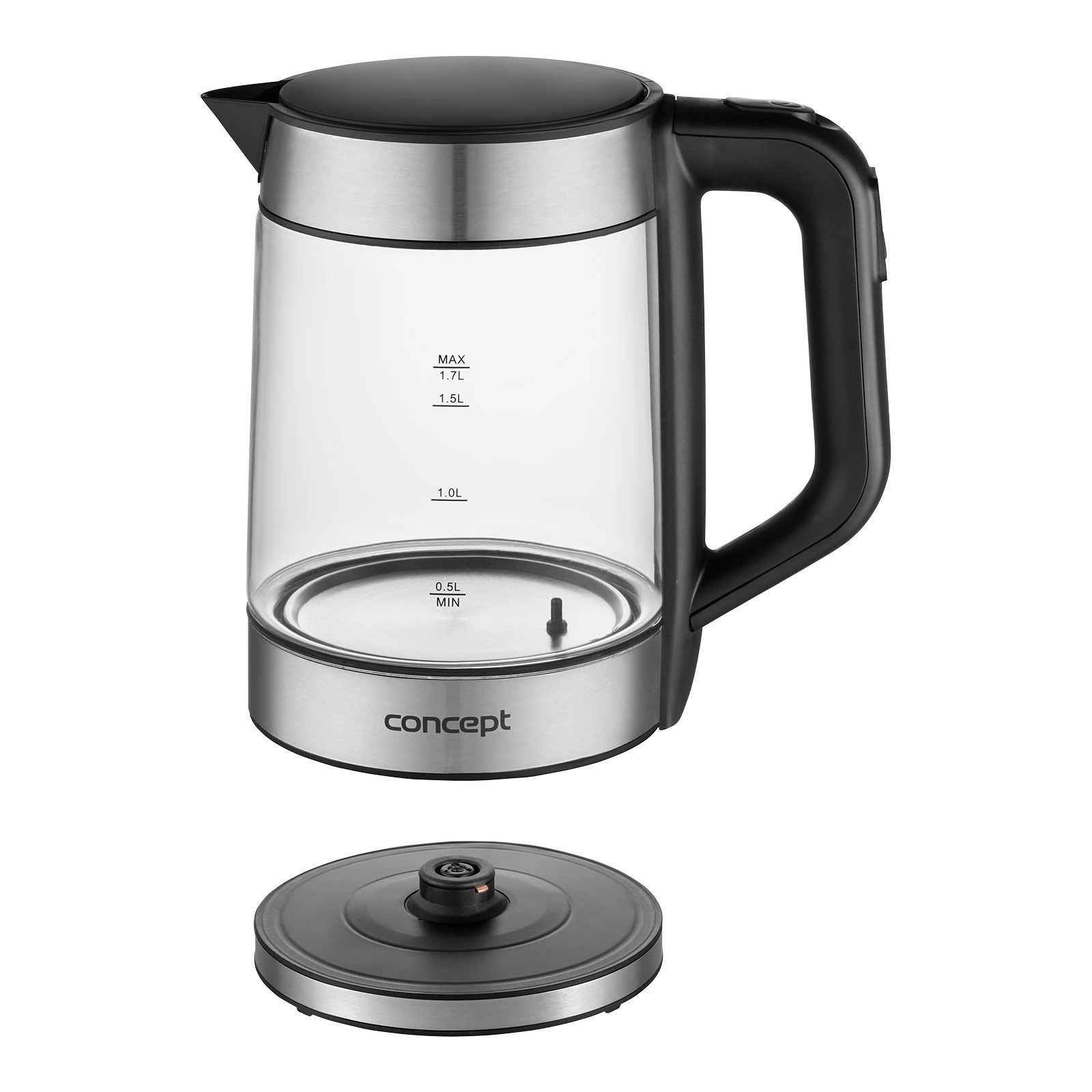 Тип: звичайний; Об'єм: 1.7 л; Потужність: 2200 Вт; Матеріал корпусу: скло; Тип нагрівального елемента: прихований (диск); Індикатор рівня води: зовнішній; Фільтр від накипу: є; Кришка: незнімна; Обертання на 360°: є; Захист: від перегріву, від включення без води, автовідключення при знятті з підставки