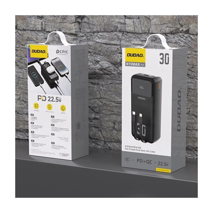 - Ви можете купити Мобільна батарея Dudao 30000mAh K15 MAX 22.5W, PD, QC, USB-A, Lightning, USB-C(In/Out), with USB-C/Lightning cables (6977196682478) (UA) в кредит