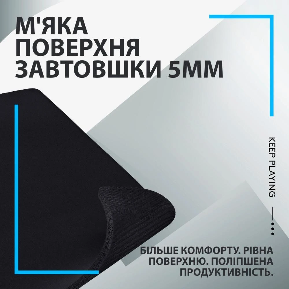Бренд: Logitech; Довжина, мм: 340; Ширина, мм: 280; Товщина, мм: 1; Матеріал поверхні: тканина; Одно / двостороння конструкція: одностороння; Сумісність з лазерною мишею: є;...
