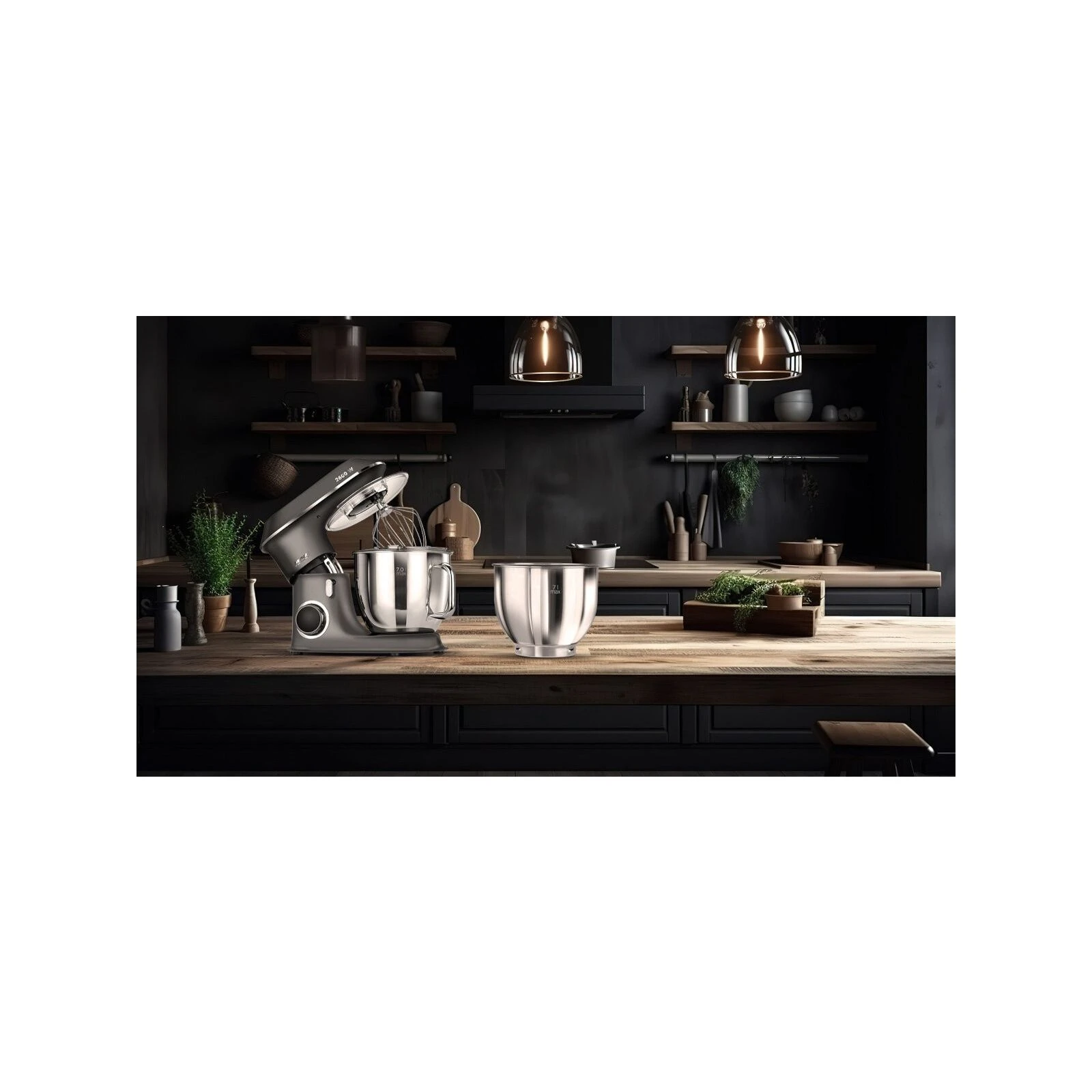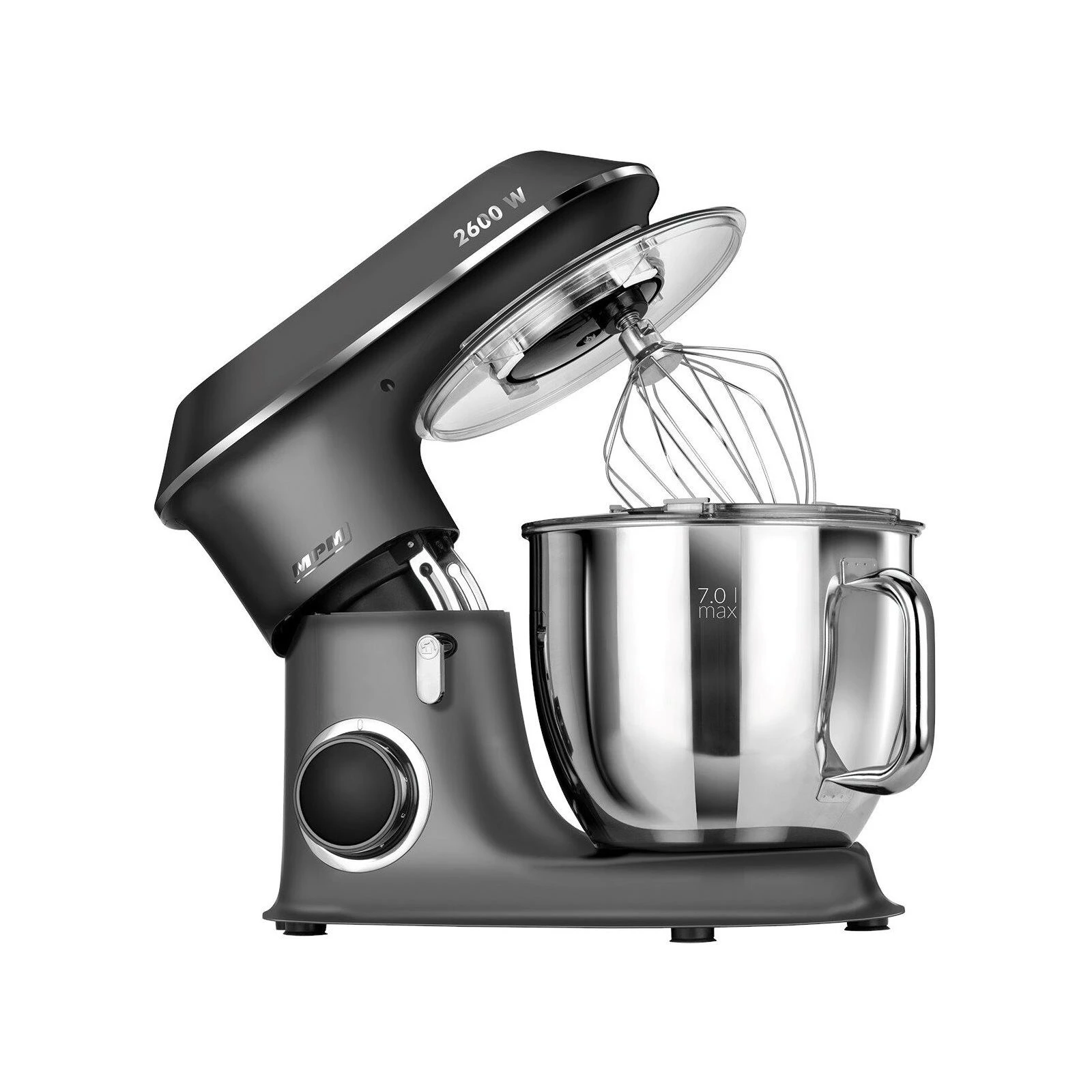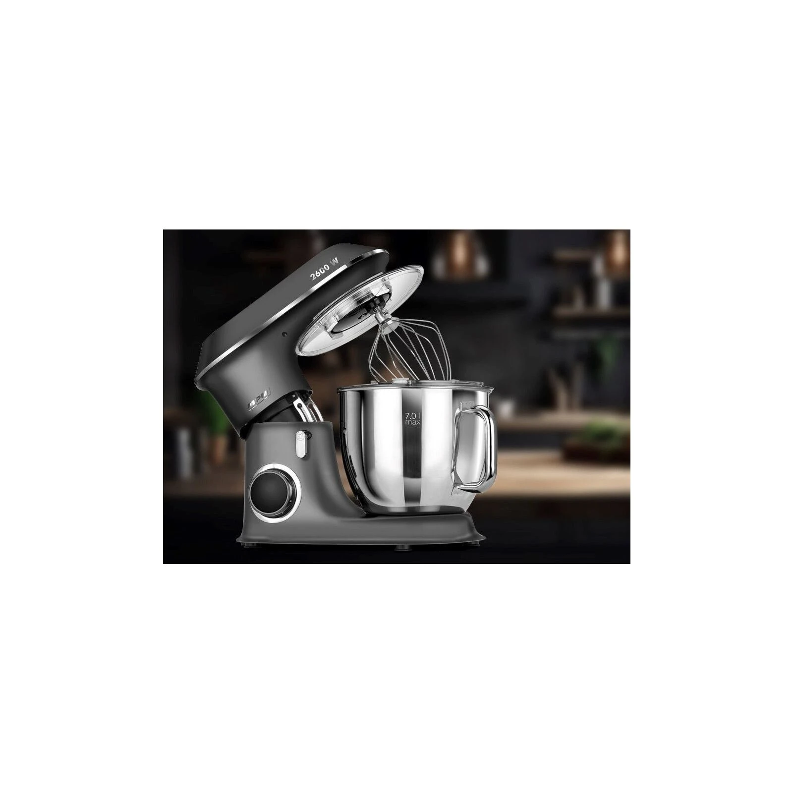 Тип: кухонна машина; Потужність: 2600 Вт; Об'єм основної чаші: 7 л; Об'єм чаші блендера: відсутній; Кількість швидкостей: 6; Режими: імпульсний; Функції: змішування, замішування тіста; Насадки: насадка для збивання, віночок; Особливості: захист від бризок, ковзані ніжки; Вага: 6.2 кг