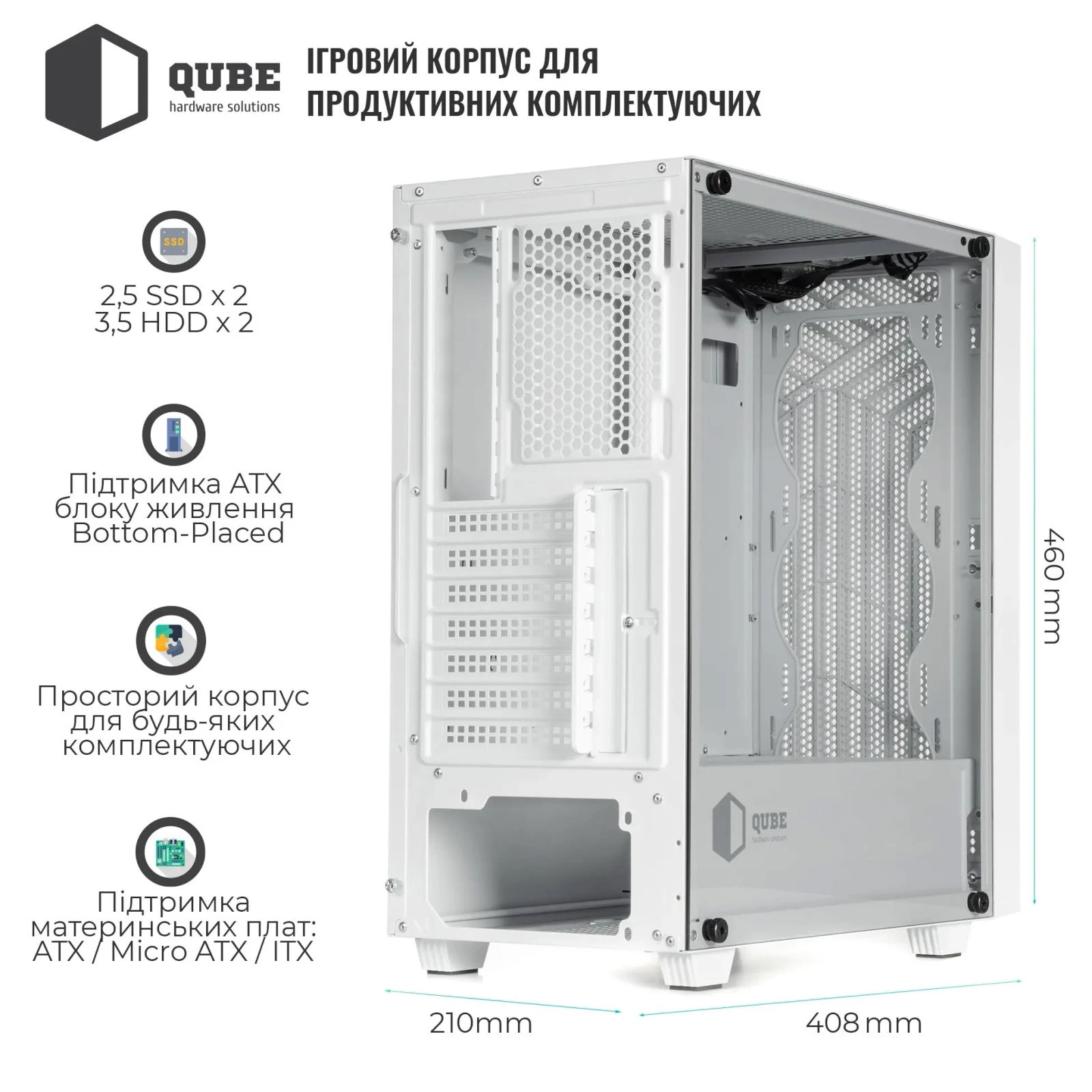 Бренд: QUBE; Форм-фактор материнської плати: ATX / MicroATX / Mini-ITX; Типорозмір: Midi-Tower; Призначення: ігровий; Потужність БП, Вт: ні; Розташування: знизу; Кількість 3,5" відсіків...