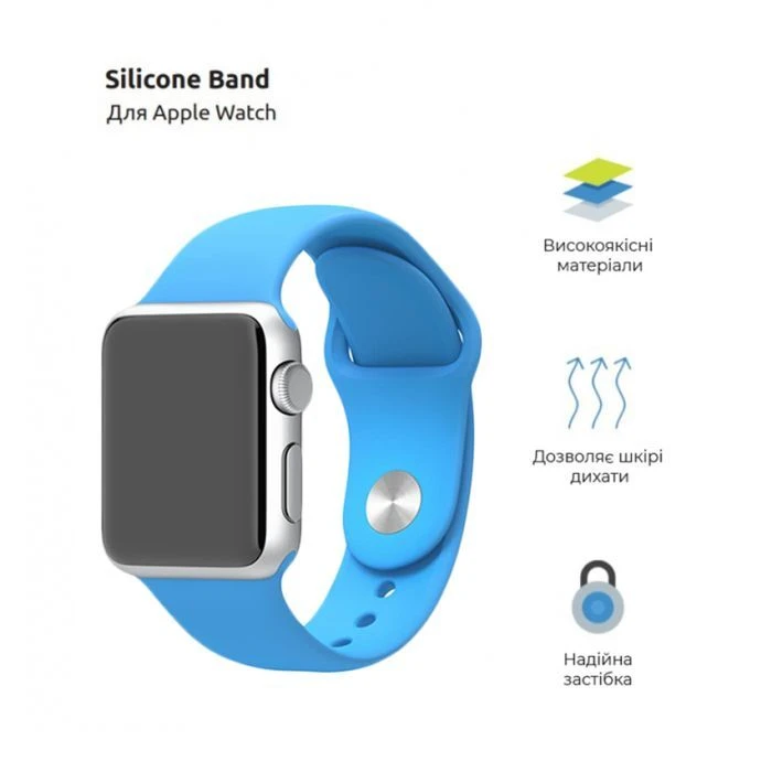 Сумісність: Apple Watch 3, Apple Watch 4, Apple Watch 5, Apple Watch 6, Apple Watch 7, Apple Watch 8, Apple Watch SE (2020), Apple Watch SE (2022); Колір: синій; Матеріал корпусу: силікон; Розміри (довга частина з отворами, ШxВxГ): 25 х 240 мм;