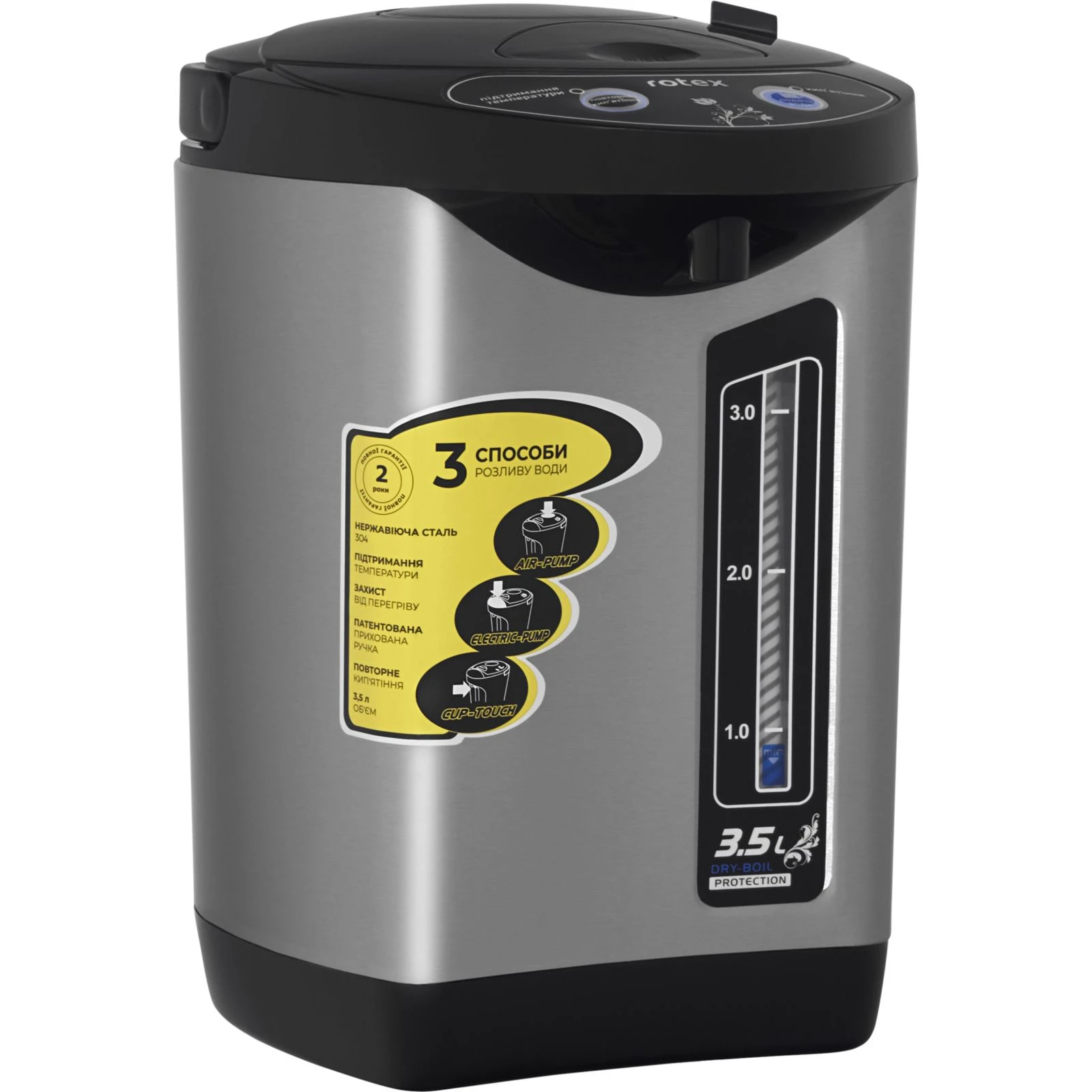 Тип: термопот; Об'єм: 3.5 л; Потужність: 800 Вт; Матеріал корпусу: нержавіюча сталь; Тип нагрівального елемента: прихований (диск); Індикатор рівня води: зовнішній; Фільтр від накипу: є; Кришка: незнімна; Захист від перегріву; Особливості: підтримання температури, світловий індикатор