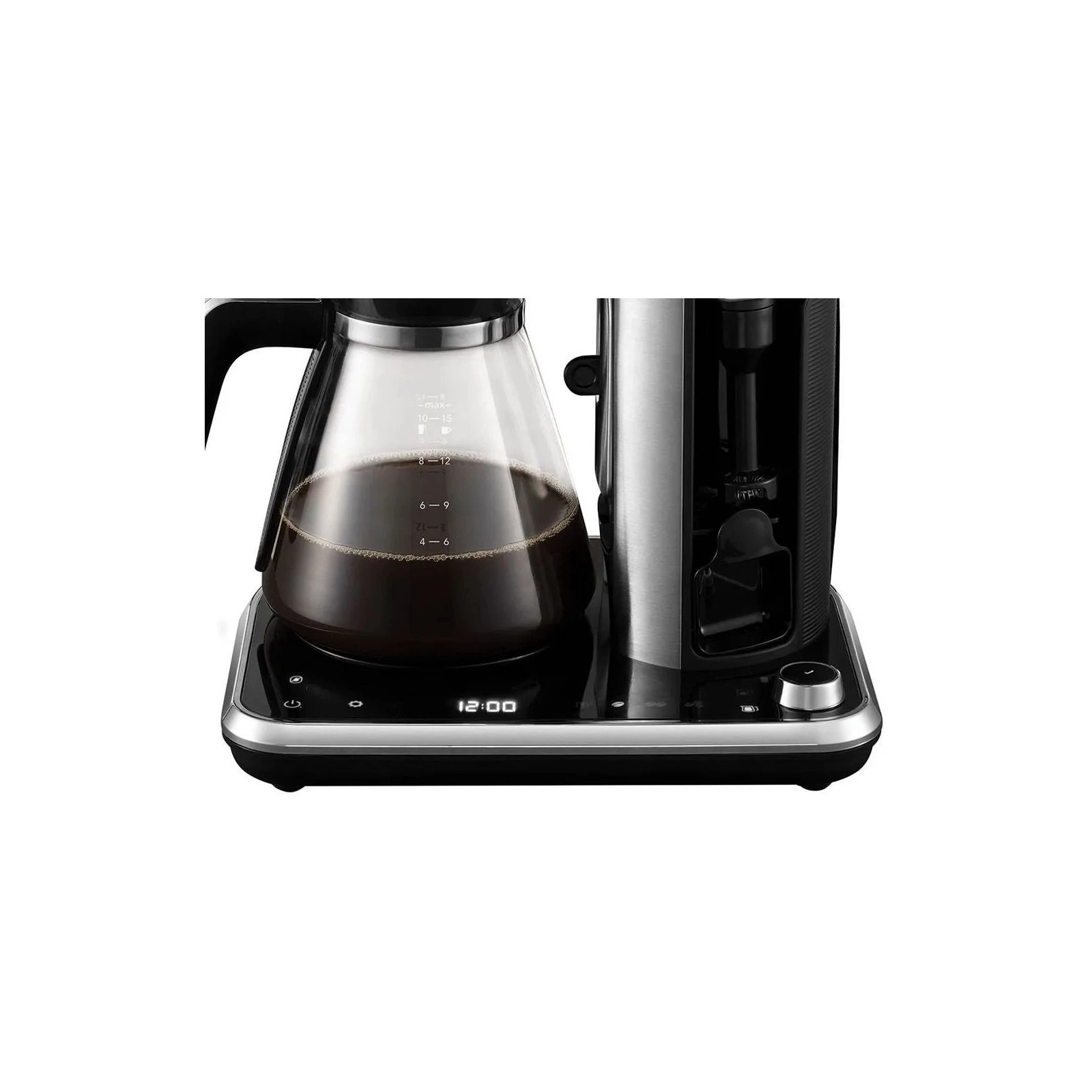 Сфера застосування: для дому (побутові); Тип керування: сенсорне; Тип кави, що використовується: мелена; Резервуар для води: 1,5 л; Потужність: 1400 Вт; Матеріал корпусу: скло, пластик; Комплектація: кавник; Функції: дисплей, підігрів чашок/кавника, можливість програмування, індикація роботи, вибір об'єму порції, автовідключення, регулювання міцності кави; Спосіб розміщення:...
