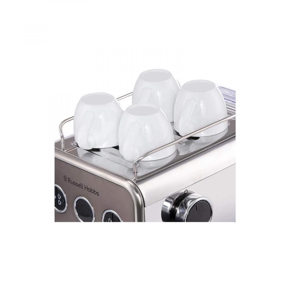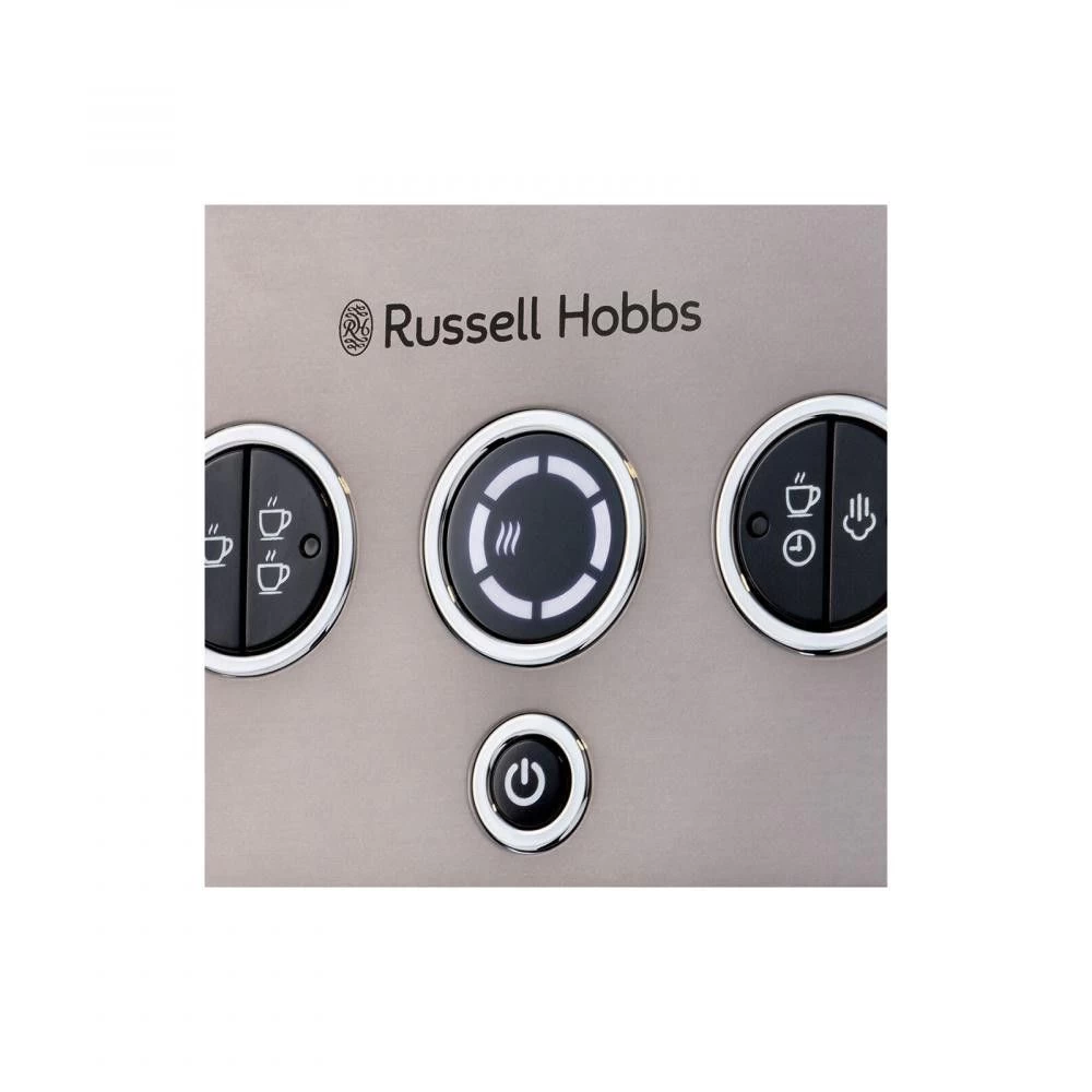 Бренд: Russell Hobbs; Спосіб встановлення: настільна; Живлення: мережа; Тиск, бар: 15; Кава, що використовується: мелена; Колір: нержавіюча сталь; Функція "Cappuccino": ручне приготування; Вибір обсягу порції: є; Подача гарячої води: є; Підігрів чашок: є