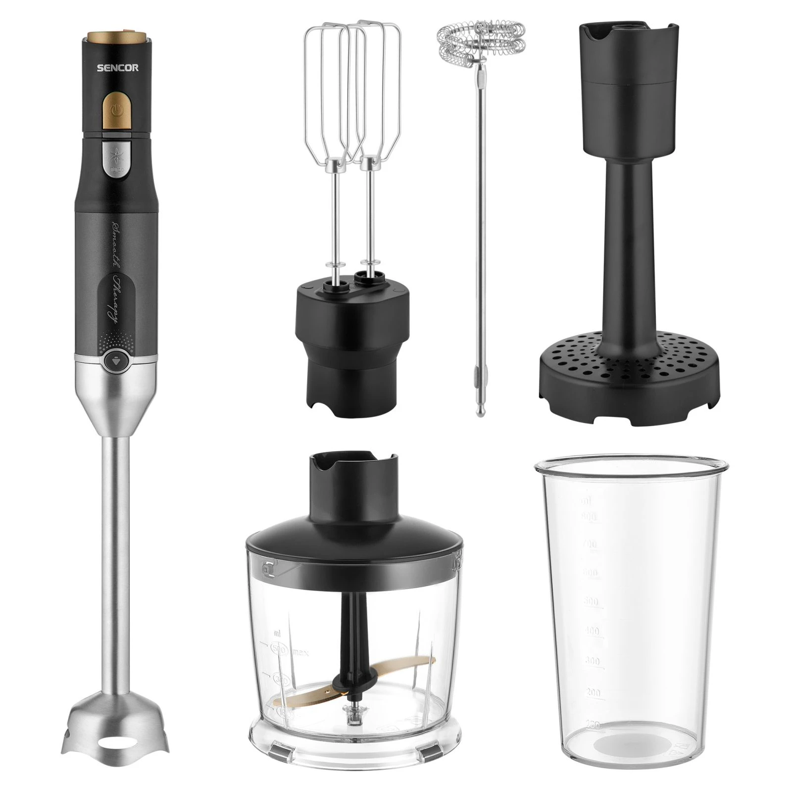 Тип: занурювальний; Потужність: 1200 Вт; Місткість мірної склянки: 0.8 л; Подрібнювач: з подрібнювачем; Місткість міні-подрібнювача: 500 мл; Насадки та ножі: спінювач молока, насадка-блендер, ніж для подрібнення, насадка для пюре; Додаткові ємності: мірна склянка, чоппер; Кількість швидкостей: плавне регулювання; Матеріал ніжки блендера: метал; Функції: турборіжим