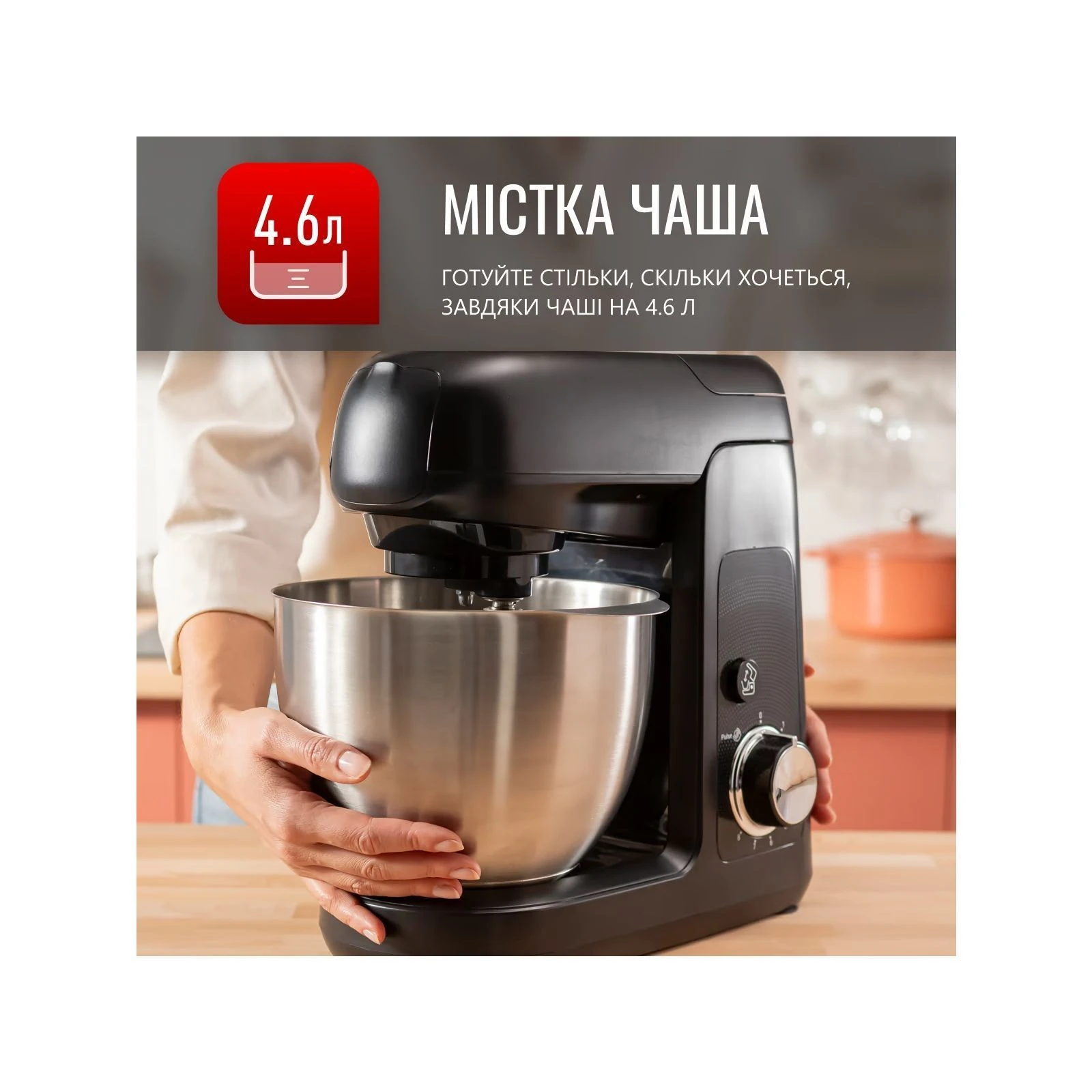 Потужність: 2200 Вт / об'єм миски: 4,5 л / об'єм блендера: 4,5 л / Функції: замішування тіста, шліфування, таймер / форсунки: подвійний котел, блендер, ніж для шліфування / ...