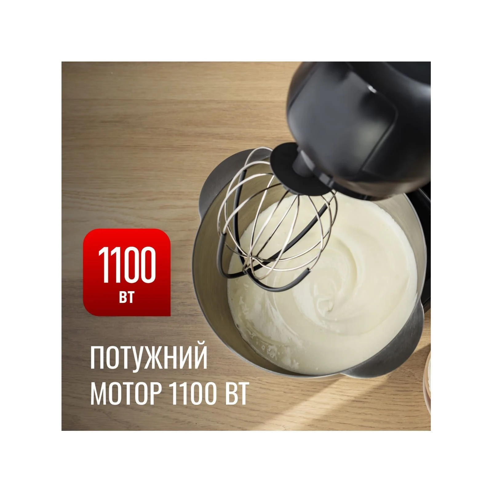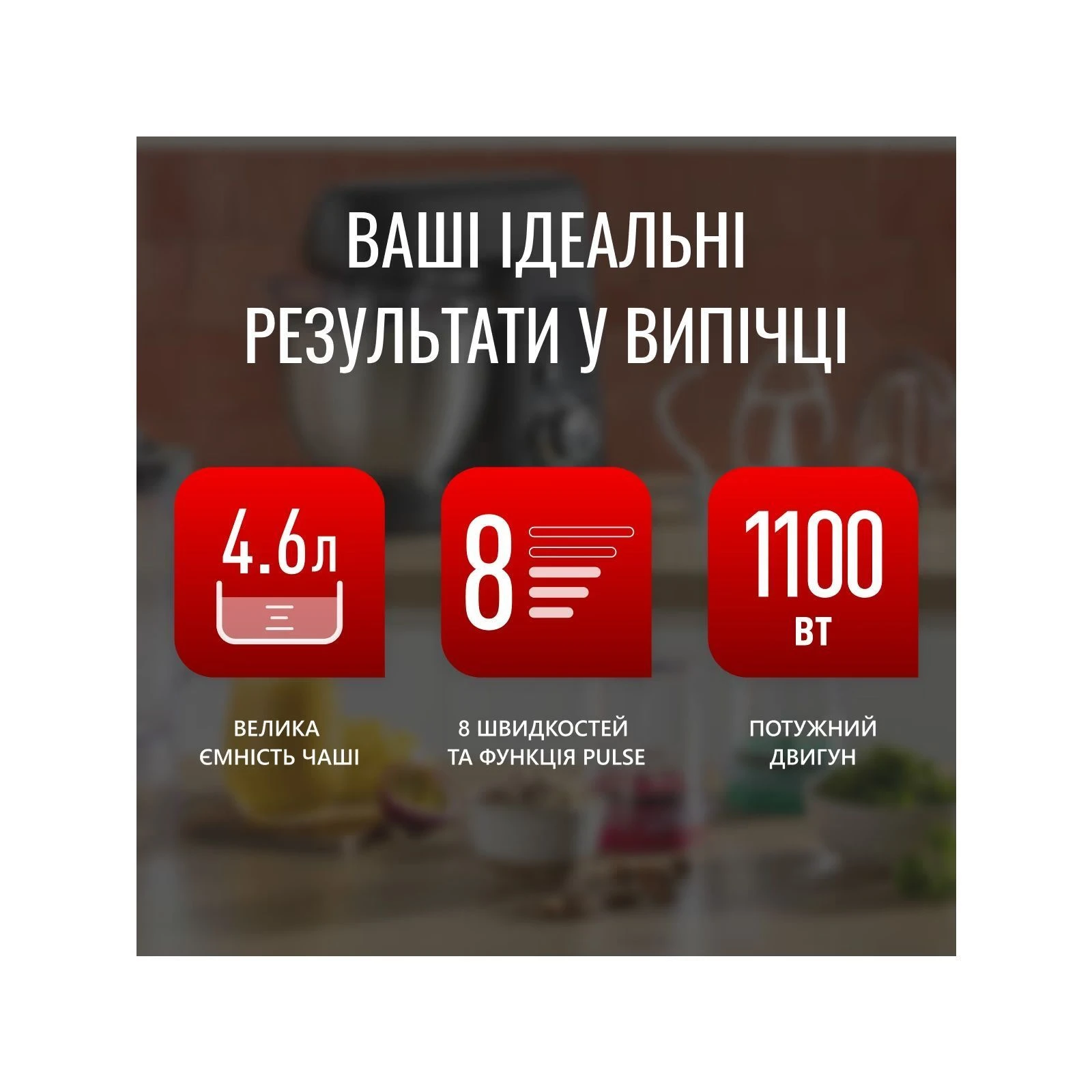 Тип: кухонна машина; Потужність: 1100 Вт; Об'єм основної чаші: 4.6 л; Об'єм чаші блендера: 1.25 л; Кількість швидкостей: 8; Функції: збивання, замішування тіста, змішування, шатківниця, блендер, терка; Режими: імпульсний; Насадки: терка, гак для замісу тіста, блендер, диски для подрібнення, диски для нарізки, віночок; Додаткові функції: можливість придбання додаткових...